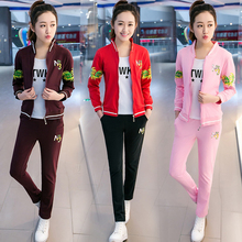 春夏季大码短袖上衣运动服套装时尚学生跑步休闲长袖长裤三件套女
