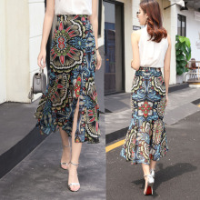2017新款碎花鱼尾裙子女夏中长半身裙荷叶边不规则雪纺包臀长裙女