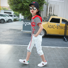 女童夏季套装2017新款韩版女孩条纹短袖t恤七分裤中大儿童两件套
