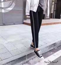 2017春季新款女士九分裤百搭韩版宽松显瘦女裤黑色拼色学生运动裤
