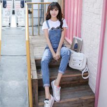 樱姿梦学院风韩版少女显瘦破洞牛仔裤女九分裤宽松背带裤女长裤
