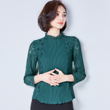 2017春装新款女装韩版修身大码长袖蕾丝网纱打底衫立领小衫上衣潮