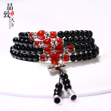 天然水晶黑红玛瑙手链情侣一对本命年108颗佛珠男女韩版多层手串