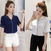 2017夏天新款韩版喇叭袖雪纺衫短袖v领娃娃衫百搭宽松上衣服女装