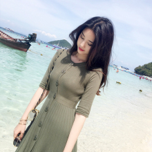 KMZY春夏新款针织连衣裙女名媛气质高腰修身百褶打底裙中袖衬衫裙