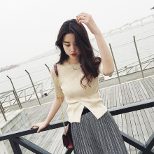 春夏装新款五分袖修身显瘦套头针织衫女薄款纯色开叉针织打底上衣