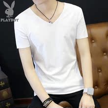 花花公子男士纯色修身v领T恤青年韩版纯棉半袖小衫男休闲夏季上衣