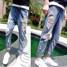 太子客春夏新款小脚裤男士哈伦裤薄款修身九分裤破洞乞丐牛仔裤潮