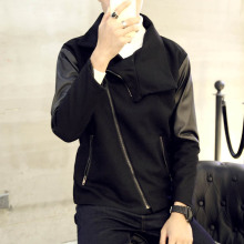 太子客毛呢大衣男冬短款外套青年英伦休闲斜拉链呢子大衣PU皮拼接