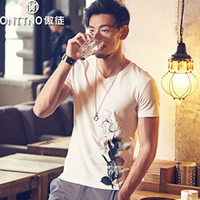 中国风男装傲徒2017新款夏季V领个性线条印花修身男士t恤短袖潮流