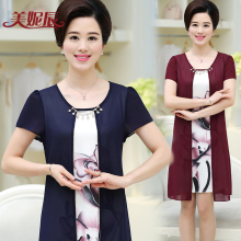 中老年女装夏装短袖雪纺连衣裙中年妈妈装40-50岁中长款假两件t恤