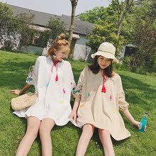 闺蜜装2017夏上新系带V领刺绣民族风五分袖灯笼袖棉麻连衣裙夏潮