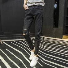 新款夏季韩版破洞潮流简约修身小脚男士九分裤 青少年小脚9分裤