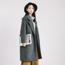 画风2016秋冬新款原创文艺复古纯色斜纹中长款呢子大衣毛呢外套女