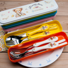 韩国进口宝宝儿童勺子叉子扁筷子餐具盒泰迪熊小熊便携学生套装