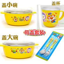 韩国进口/儿童/pororo 防滑小企鹅不锈钢盖杯盖碗宝宝餐具套装