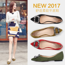 2017新款范百丽女单鞋尖头平底浅口女鞋甜美水钻四方扣舒适平底鞋