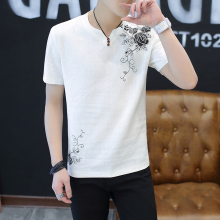 男士亚麻夏季棉麻短袖t恤修身刺绣青年复古中国风男装潮半袖衣服