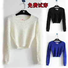欧美性感紧身弹力高腰短款露脐马海毛绒绒圆领长袖套头毛衣女
