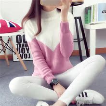 冬季韩版半高领短款套头毛衣宽松拼接撞色针织衫女装毛线衣上衣厚