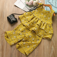 笑然家韩版女童棉麻套装儿童碎花娃娃裙衫阔腿中裤两件套装2017夏