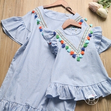 亲子母女装女童条纹短袖连衣裙中大儿童纯棉木耳边流苏裙衫2017夏