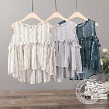 日系杂志款碎花柄印花木耳花边前短后长甜美无袖雪纺衫上衣