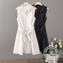 日系ING西装翻领清新条纹格子系蝴蝶结收腰甜美无袖背心连衣裙子
