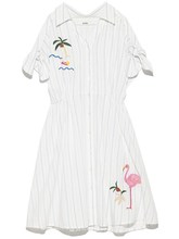 【iamfino】清新条纹 袖口绑结 刺绣海边椰树觅食火烈鸟 连衣裙