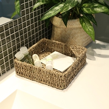 KENS 草编桌面收纳盒 正方形纸巾盒 浴室用品收纳盘 杂物筐