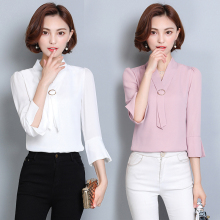 雪纺衫女短袖2017春夏装新款韩版V领气质套头七分袖打底衫上衣潮