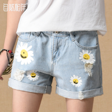 自然相伴浅色牛仔短裤女夏天薄款印花破洞宽松卷边牛仔裤热裤韩版