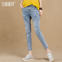 自然相伴浅色破洞牛仔裤女夏薄款九分裤宽松哈伦裤弹力小脚裤韩版