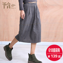 予含竖条纹亚麻半身裙2017夏薄款棉麻文艺花苞裙子大码显瘦女胖MM
