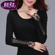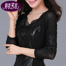 爱衣买衣 网纱打底衫女长袖2017春装时尚新款纱衣蕾丝修身t恤6040