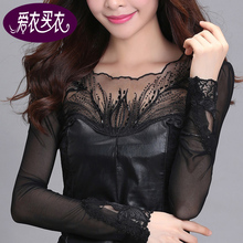 2017春装pu皮衣打底衫修身 秋冬时尚新款长袖蕾丝镂空女士上衣潮
