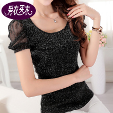 爱衣买衣 网纱打底衫女2017夏泡泡袖金银丝短袖显瘦t恤8076