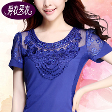 爱衣买衣 2017新款蕾丝修身网纱打底衫女镶钻镂空短袖t恤女夏9077