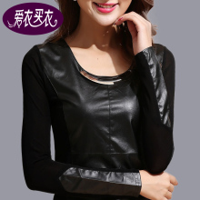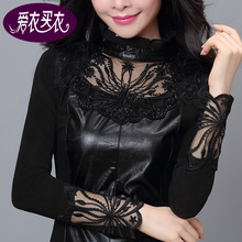 爱衣买衣 加绒打底衫女长袖秋冬2017时尚新款 pu皮衣女蕾丝衫6132