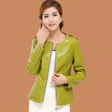 2017春装新款海宁正品皮衣 女士圆领修身常规款皮夹克时尚小外套