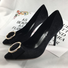 2017春新款天鹅丝绒浅口尖头单鞋女时尚方扣蝴蝶结女鞋细跟高跟鞋