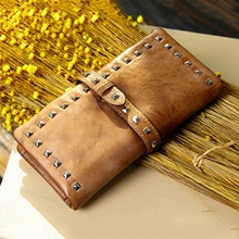 2017新款文艺复古长款手拿包个性铆钉头层真皮女士钱包手工擦色