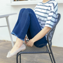韩国高腰毛边显瘦弹力深蓝色小直筒九分裤微喇叭牛仔裤女学生八分