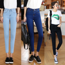 韩国代购春秋深蓝色高腰牛仔裤女九分裤紧身黑色铅笔小脚裤显瘦潮