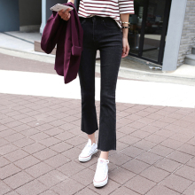 韩国代购高腰毛边微喇九分牛仔裤女显瘦阔腿弹力9分裤黑色喇叭裤