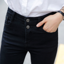 秋季女士排扣黑色牛仔裤女韩版修身显瘦小脚裤高腰弹力铅笔裤长裤