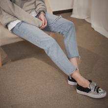 韩国代购学生宽松高腰破洞牛仔裤女bf风显瘦阔腿直筒裤九分裤浅色