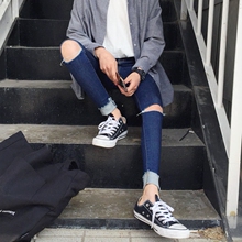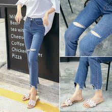 秋季高腰黑色破洞牛仔裤女膝盖破洞小脚铅笔裤紧身九分裤韩国9分