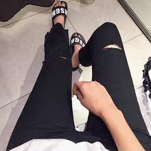 韩国代购高腰膝盖破洞牛仔裤女乞丐裤毛边九分裤紧身小脚裤夏黑色