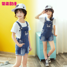 女童夏季套装2017女孩牛仔背带裤短裤T恤套装中大儿童短裤两件套